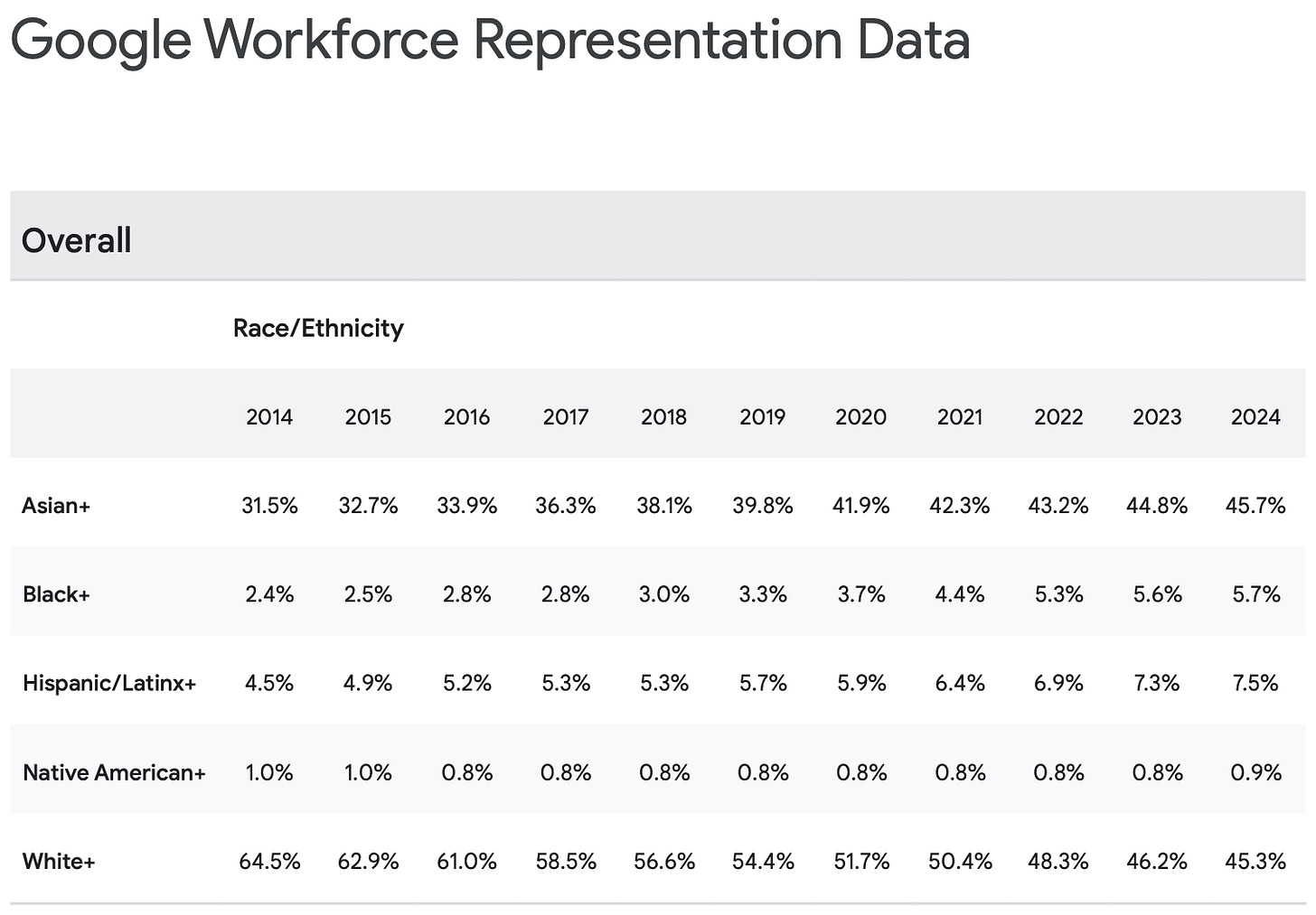 Google 2024 Diversity Report as a sample. Notably Asians make up 7% of the US Population, Blacks 19%, Whites 60%, and Native Americans 2%