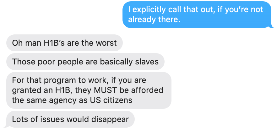 There were plenty of individuals on H1Bs from minority backgrounds, who were being underpaid and treated poorly and overworked. Immigrants on H1Bs have very little leverage because they risk deportation on being fired. Additionally, the law is very clear that H1Bs must be paid market rate, and also that you must first try to hire an American. Whenever I looked up the data of the H1Bs, which is publicly available, they were being underpaid significantly. There wasn’t much that I could do about it except speak privately to others to try to get them raises. This resulted in there being a strong incentive to hire those individuals over Americans. Recently, Lucky Palmer the CEO of Anduril has spoken out about this abuse which has made me happy.